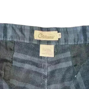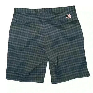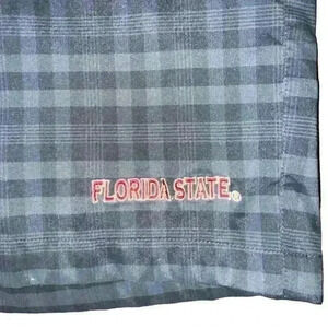 These are pre-owned men's shorts by Chiliwear. They are size 38 and are made of 80% cotton and 20% polyester. The shorts are black and gray plaid with a Florida State logo on the right leg and a Seminole logo on the back pocket. They are performance material. The shorts have a zipper fly and button closure. They have two front pockets and two back pockets. The shorts measure approximately 18 inches in length and 17 inches across the waist. The shorts are in great condition with no visible tears or stains.