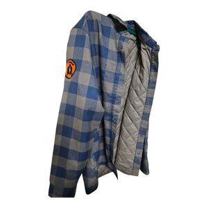 Men's size Large. Thick Insulated Flannel with button snaps. Colors are primarily Dark blues and tans (plaid design). Please note color in photos and in person may vary due to lighting. Also, please note this has a patch on the right arm (see photos). Shirt is in excellent, lightly used condition.
