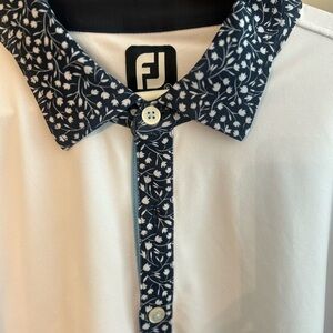 Men's Footjoy White Polo Shirt with Navy and White Microfloral Patterned Collar