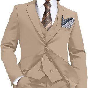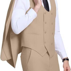 Features: This sleek slim-fit suit includes a one-button jacket with a double-breasted vest and modern flat-front pants, all in a stylish champagne hue. The suit offers a tailored silhouette that’s great for formal events or elevated casual looks. Versatile enough to mix and match with other pieces for a personalized style.
