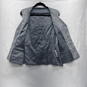 The Mens Black Plaid 3 Piece Suit by T Fusion in size 40R 34W is a stylish and sophisticated outfit perfect for any formal occasion. Made from high-quality polyester, this suit features a classic grey plaid design with a light blue color accent. The 3-piece style includes a jacket, pants, and a vest, offering a complete and polished look. This suit is sure to make a statement and leave a lasting impression. The pants have buttons for suspenders, the inside is lined in a paisley pattern with blue accents.