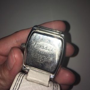 Men's Fossil watch with removable leather strap. It originally came with a black strap that I wore out, purchased the white leather strap to replace it. You can always get addition straps. Face has date with grey and orange outline. It needs a new battery, I haven't worn it in quite some time. Still in good condition. Make me an offer!