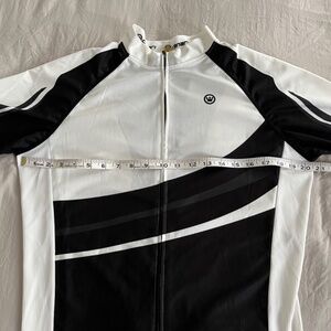 Black and white Canari men's cycling jersey. Full front zip. three back pockets.
