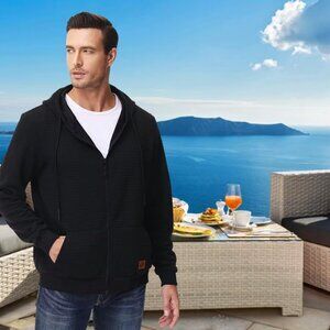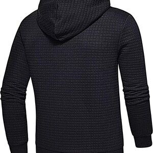 Features: This men's hoodie combines a sleek black Jacquard plaid fabric with a practical zip-up design. It has a double-layer hood with an adjustable drawstring, making it cozy and customizable. The ribbed cuffs and bottom band with stretch add comfort and shape retention. Two pockets and a subtle leather label on the left add stylish details that elevate the classic hoodie look.