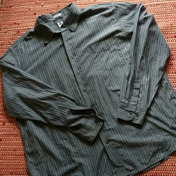 Steel gray with white pinstripes, color is a little darker than shows in the picture. Gently warn, excellent condition. Measurements pit to pit 27", length shoulder to hem 30". Dress up or down. *from a smoke free home*