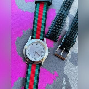 Mens authentic GUCCI quartz movement watch in great working order. It just got new replacement ( off market) strap which looks more attractive and more dressy than old one ,but I will include old strap also, in case you want to use Gucci buckle on other leather or rubber strap.