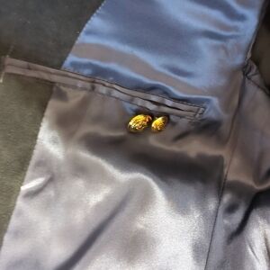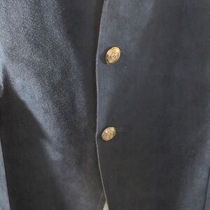 Like New Custom Made Navy Blue Suede Suit Coat / Jacket / Blazer. Made by New Fashion LTD. in Kowloon, Hong Kong. Two gold-tone front button closure. Each sleeve has three gold-tone accent buttons. Two extra buttons come with jacket. Vented Back. No measurement tags, so please see measurements listed below. Measurements taken while jacket was lying on flat surface. Dress for success at the office or show your style at a wedding or party. Excellent Pre-Owned condition. No flaws.