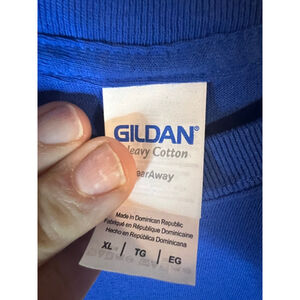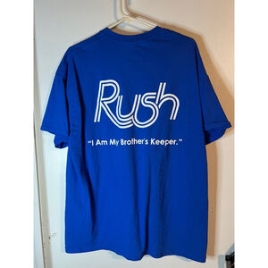 This is a pre-owned, blue Gildan Heavy Cotton t-shirt, size XL. The front features a small, white "Rush" logo on the left chest. The back displays a larger "Rush" logo with the phrase "I Am My Brother's Keeper" underneath. The shirt shows minimal signs of wear, with no visible stains or tears. The fabric appears slightly faded, consistent with previous use and washing.