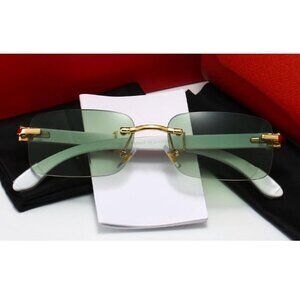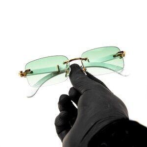 Mens Gold Frame Mint Green Tint Rimless White Woodgrain Arm Buffs Sunglasses
