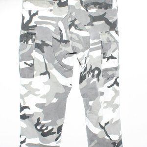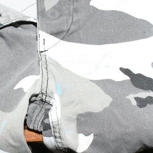 Men's adjustable size gray camo pants. Military Issue. Inseam 29-1/2"-32." Waist 31'-35." Buttons, pockets, belt loops and pants are in great shape, they just have some paint splatter on them. That's the "character" mentioned in the title. The pictures reveal all the paint. My 17yo son tells me that pants with paint/other cosmetic defects are popular with Gen Z. Who knew?