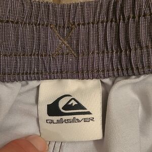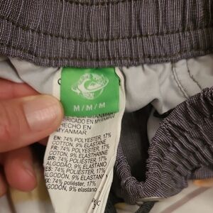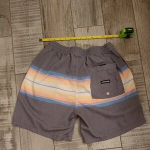 Dive into style with these men's swim shorts featuring a sleek gray base and vibrant multicolor stripes. Perfect for a day at the beach or pool. Very good used condition.