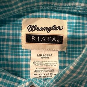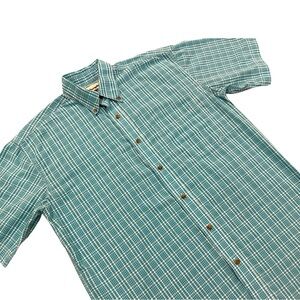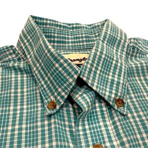 Stylish plaid shirt. Features button-up front. Perfect for casual wear. Color is almost an aqua blue.