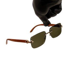 Men's Green Tint Rectangular Hip Hop Gold Frame Leopard Head Rimless Sunglasses