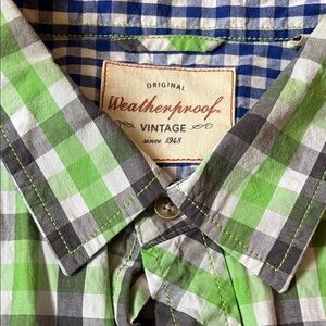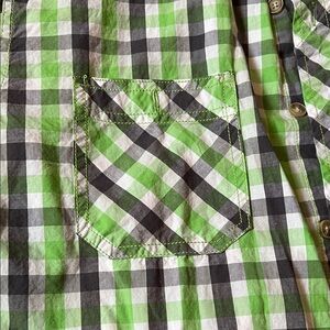 Stylish men's button-down shirt featuring a green and white plaid design. Perfect for casual outings with dual chest pockets for added convenience.