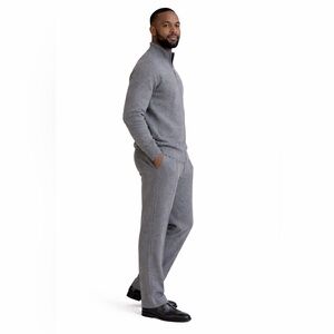 The suit features a tailored zip-front sweater jacket crafted from premium wool, offering a smooth, soft texture and natural warmth. The jacket includes a modern stand collar, full front zipper, and ribbed cuffs and waistband that provide a structured yet comfortable fit. The natural breathability of wool makes it ideal for year-round wear while maintaining a polished look.