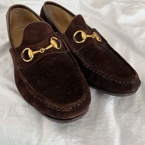 Men's Gucci Brown Swede Classic Style Loafers Gold Horseshoe Bit 41.5/8.5