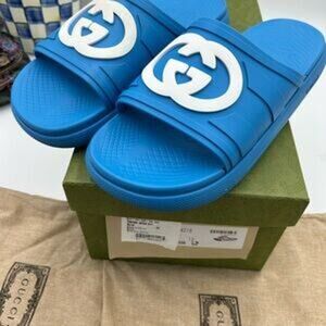 Step into luxury with these brand new Gucci Interlocking G rubber pool slides! These stylish slides are perfect for adding a touch of designer flair to your casual look.