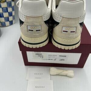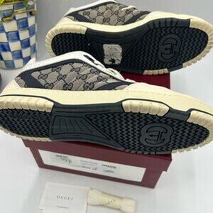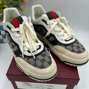 Step out in style with these absolutely like-new Men's Gucci Re-Web canvas and leather sneakers! Made in Italy, these sneakers exude luxury and high fashion.