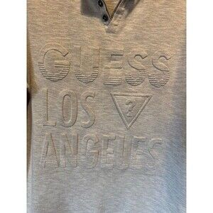 The product is a men's Guess Los Angeles textured raised logo Henley T-shirt in a medium size and grey color. It features short sleeves, a Henley neckline, and a solid pattern. The shirt is made of a blend of polyester and cotton, with a vintage look. The Guess logo accents add a unique touch to the design, making it a stylish and comfortable addition to any man's wardrobe.