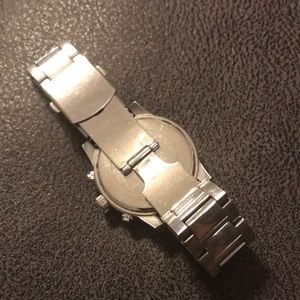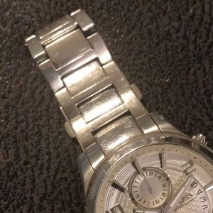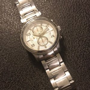 Men’s steel used watch. General scratches from being previously used. Needs a new battery.