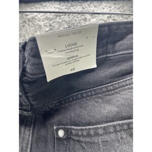 These H&M loose fit jeans in black size 33x32 are a stylish and versatile addition to any man's wardrobe. Made from a comfortable cotton blend denim fabric with a straight leg style, they feature a zip and button closure, pockets, and are machine washable. The loose thigh and knee fit provides a relaxed and on-trend look that can be worn in any season. Perfect for everyday wear or dressed up for a casual occasion, these jeans are a must-have item for any fashion-forward man.