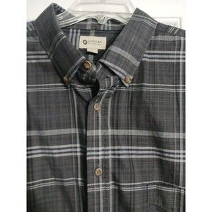 Men's Haggar long sleeve button-down shirt size Large. Gray and black plaid. 55% cotton 45% polyester. Don't know if he ever wore this. Very good pre-owned condition.
