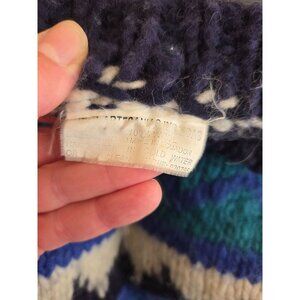 Mens Hand knit Wool Sweater Blue White Geometric Chunky Equador L Blike core