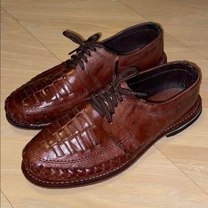 Handmade leather shoes/huaraches made by Mexican artisans. All leather well made. I bought these during a trip to Guadalajara, Mexico. I wore them a few times during a Mexican Riviera cruise and received lots of compliments. Great for that Instagram/snap chat post. They don’t have a size on them but I normally wear 9 size shoe, so I’m guessing it’s around a size 9. They are leather so they do tend to stretch a little.