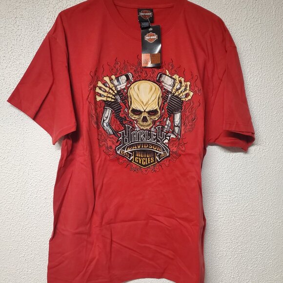 The Men's Harley Davidson Panhead Fire Chili Pepper Short Sleeve Large T-Shirt is a new and stylish addition to any biker or motorcycle enthusiast's wardrobe. Made of comfortable cotton knit fabric, this red shirt features a graphic print design with the iconic Harley-Davidson logo accents. The crew neck and regular fit make it perfect for casual wear during the summer, fall, or spring seasons. Proudly representing the brand's heritage and style, this T-shirt is machine washable for easy care and maintenance. New with tags. Smoke free home. Measurements: 29" Length, 21" Pit to PIt, 15" Sleeve.