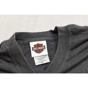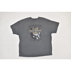 This listing is for a Harley-Davidson Road Hog T-shirt in Big & Tall Size 2XL. This shirt is a tribute to Harley-Davidson's legacy with its distinct front graphic of a skull on a motorcycle. On the back, it features the classic bar and shield logo with 'Dallas, Texas' text, making it a great find for collectors or fans of the Dallas location. It's made from a comfortable blend of 60% pre-shrunk cotton and 40% polyester. This is a classic fit t-shirt perfect for casual wear. The color is a versatile dark gray or charcoal heather. The shirt is in good used condition with some minor fading, but no visible stains or tears. Please refer to the photos for a closer look at the condition and measurements.