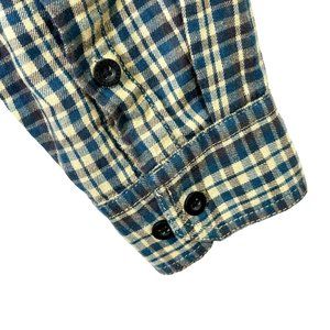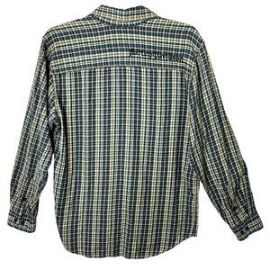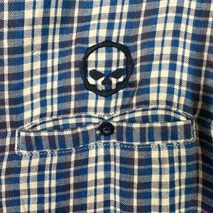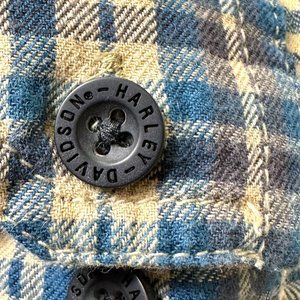 Harley-Davidson very soft plaid flannel shirt in shades of tan and blue. Lots of branding on this shirt, on the back sright shoulder, the buttons, and around the neck band. On the left chest there is a button pocket with an embroidered skull above it. Collar snaps down. Fabric is 100% cotton. No stains or flaws noted. Tag size large. See measurements below.