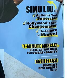 Other cover lines include: Simu Liu is "Action's Next Superstar," "Hollywood's New Changemaker," and "The Future of Marvel"; "7-Minute Muscle! Ultrafast Workouts for Sweat + Sanity"; and "Grill It Up! Summer's Best Burger Page 34."