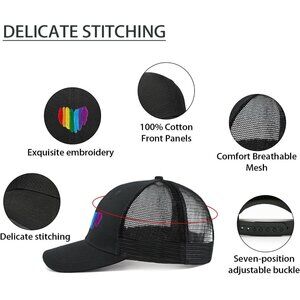 This rainbow cap is not just an ordinary hat. It features a beautiful iconic rainbow flag embroidery design, comfortable and breathable mesh, adjustable sizing feature, and exquisite stitching. It is the perfect choice for anyone looking to express support for the LGBTQ+ community and participate in Pride events.