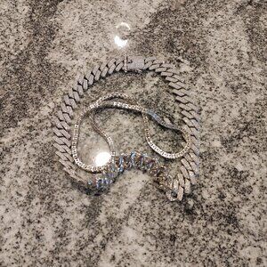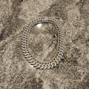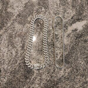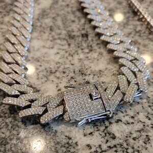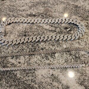 Men's Iced Heavy Cuban Chain (2 Piece) Necklace Approximately 20"+18" - Color Silver. Pre-Owned. In Good Condition. The base metal is stainless steel. Please see pictures because they are part of the condition description.