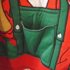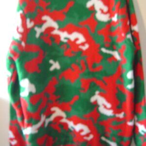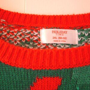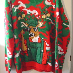 Men's Holiday Time red, green & white Camouflage print sweater--appliqued reindeer on the front--reindeer has a pouch for snacks/drink. Antlers are decorated with shiny "ornaments". Size 2XL-50-52. 100% acrylic. Back length is approx. 30" long & width at bottom is 23". Sweater is in good condition.