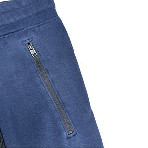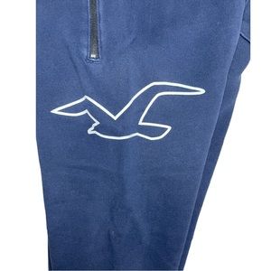 Men’s navy blue Holister Co. sweat pants. Men’s size XXS (waist 23-25). Features two front zipper pockets, a back pocket, and an draw string waistband. One end is flared.