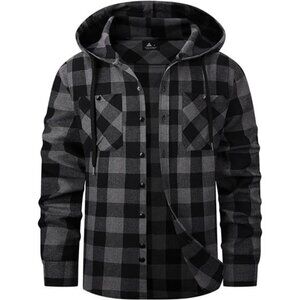 Mens Hooded Flannel Shirts Hoodie Black Dark Grey