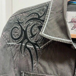 Gray button-up shirt featuring intricate black embroidery and front pockets. Stylish design with contrasting cuffs. Gray with fade and embroidery