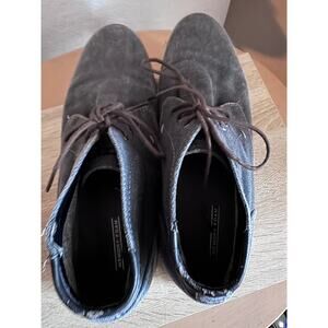 Men's IZOD chukka boots in size 11M, featuring a stylish gray canvas upper with brown laces. These slip-resistant boots offer comfort and durability, perfect for casual or semi-formal wear. The soles have a hexagon tread pattern for excellent traction. In great condition with minimal signs of wear. A practical and versatile addition to any wardrobe.