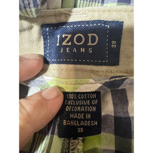 These are pre-owned IZOD Jeans cargo shorts, size 38. The shorts feature a plaid pattern in shades of green, white, and navy. They are made of 100% cotton. The shorts have a button and zipper closure, belt loops, and two front pockets, two back pockets with button closures, and two cargo pockets with button closures on the sides. There are no visible stains or tears.