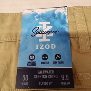 The product is a pair of NWT Men's IZOD Saltwater Stretch Chino Khaki Shorts in size 30 with a classic fit. These shorts feature a solid pattern in khaki color, made from a cotton blend material with a mid-rise. They have a zip closure, flat front, and slash pockets. The inseam is 9.5 inches, making them suitable for various occasions like travel, casual wear, work, and business meetings during the summer, fall, and spring seasons. The stretch design adds comfort and flexibility to the classic chino style.