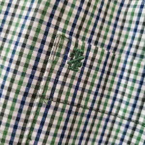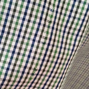 Men's Izod green & purple/blue microplaid button-down dress shirt, size XL extra large. Garment is in excellent pre-owned condition with no stains. There is a small hole (see pic) on the lower part of the shirt that would typically be tucked into pants. It is also not a full hole in that it is pretty disguised unless pulled. Measurements are approximately 30" in length 25.5" from pit to pit. Material content is 60% cotton/40% polyester.