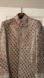 Includes the sherwani jacket and the dupatta (you’ll need to add red or beige pants). This is a one of a kind custom piece made in India for our wedding. Very heavily embellished, the entire front is covered with stone work and embroidery. Equivalent pieces now would run $3000 USD or more in India.
