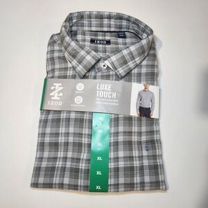 This is a men's Izod dress shirt in size XL, featuring a gray plaid pattern. It has long sleeves, a collared neckline, and a button closure. Made of a blend of 65% cotton and 45% polyester fabric with stretch, it has a regular fit and button-down collar style. The shirt is suitable for various occasions like casual wear, formal events, parties, work, and travel.