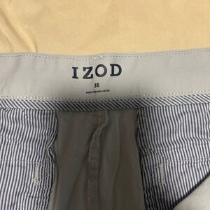 Classic Izod men’s shorts in size 38. Flat front design with belt loops, side pockets, and back welt pockets. Lightweight and versatile neutral color — perfect for casual wear, summer outings, golf, or everyday comfort. Easy to dress up with a polo or keep casual with a tee.