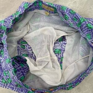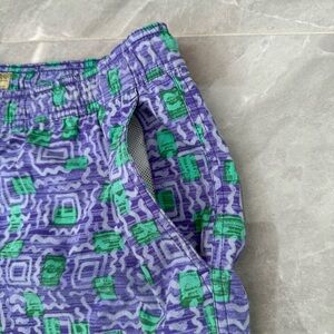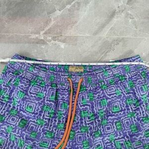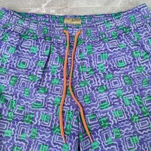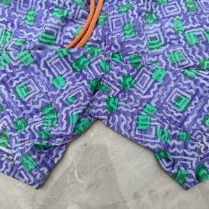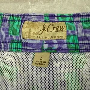 Good condition - Men’s J. Crew Original Swimwear Vintage Patterned 6” Inseam Swim Trunks. Has elastic waistband with drawstring, lining inside, two pockets on the sides, button closure pocket on back (extra button on inside tag), and hidden pocket inside the waistband in the front. Colors: blue/purple, green, and orange. Size: L.