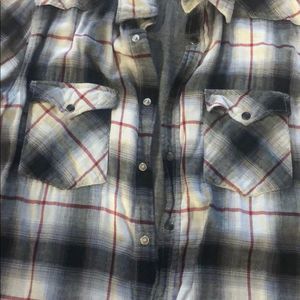 In great condition, Men’s button down (clasps) plaid shirt. Has two front pockets and clasps on the sleeves as well. Size XXL (but fits more like an XL)