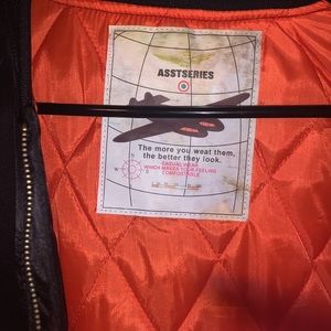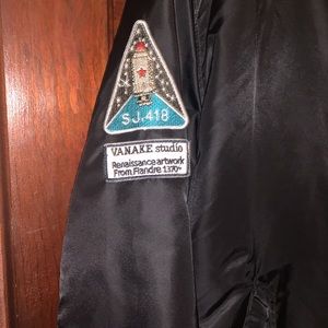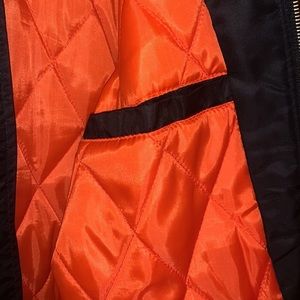 Mens Black with orange lining inside, side pocket and 1 inside pocket. 5 total embroidery patches and zips up the front.