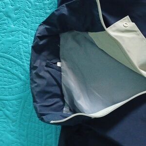 embroidered with Caesars lAtlantic City logo. never worn. just wrinkled from being packed away. Two tone navy /biege, zipper front. hidden hood on back of collar ,elastic cuffs