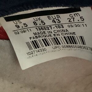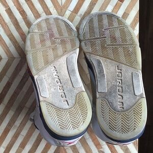 Classic Jordan sneakers with a bold red accent. High-top design for support. Ideal for everyday wear. Very creased. One of them has stained laces. Significant scuffs and dirtiness on the outside of both. Otherwise in very good condition. Very wearable. Not authenticated.